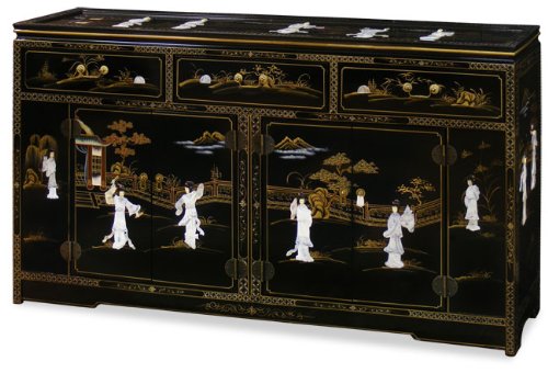 Inspired by 18th century European interpretations of traditional Chinese motifs, our magnificent sideboard is beautifully hand-painted with black lacquered on hardwood and decorated with mother of pearl dancing figures. This unique chest can be used as a sideboard in dining room, a dresser in bedroom or a hallway chest. The three felt-lined drawers and a two-door cabinet with a removable shelf inside provide ample storage space. Topped with a 1/4” thick glass for your convenience. Please see matching mirror Part No. MMI05MBG. Read more...