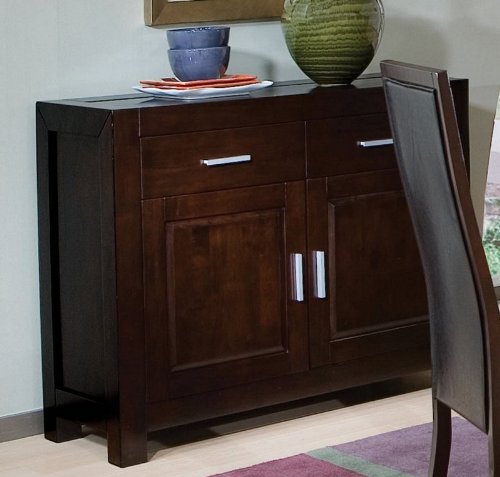 Dimension: 42"L x 16"W x 34"HFinish: Cappuccino, BlackMaterial: Hardwood, Veneer, GlassServer Sideboard with Black Glass Top Inlay Cappuccino FinishFeatures tempered black glass top and offers lots of storage possibilities with spacious drawers and cabinets.This sleek looking server will be a great addition to any home.Add elegance and style to your home with this magnificent item.Matching dining table and dining chairs are available separately.Assemble required. Read more...