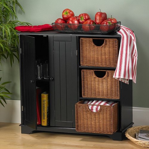 Finish:Black Cute and accommodating, this country chic sideboard is the perfect accent for kitchen, dining room or child's room. Contemporary construction, bead board cabinet doors, and honey oat wicker baskets create a casual, yet stylish atmosphere. The distressed finish allows the beauty of the three vertically aligned wicker baskets to really stand out. This adorable sideboard unit makes the perfect storage and accent unit for all of your cookbooks, tablecloths, dinnerware, or even children's toys Baskets measure: 13'W x 10'D and 7'H Behind the two cabinet doors is a single fixed shelf that divides the storage area in half Bead board cabinet drawers Read more...