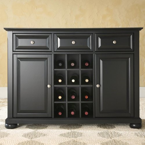 Finish:Black Constructed of solid hardwood and wood veneers, this buffet server/sideboard cabinet is designed for longevity. The beautiful raised panel doors & drawers, provide the ultimate in style to dress up your home. Style, function, and quality make this Buffet Server a wise addition to your home. The three deep drawers provide an abundance of storage space Behind the two doors, you will find adjustable shelves and storage space for things that you prefer to be out of sight The center storage area is great for up to 12 bottles of wine, or if you prefer, remove the wine storage cubes to reveal an adjustable shelf Hand rubbed; Multi-Step finish Read more...