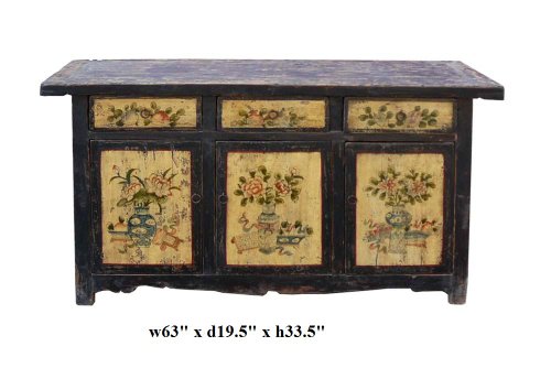 This is a decorative flower graphic Chinese Mongolian style low table with compartment and 3 drawers for storage. Its old vintage accent enriches the interesting tone to the room.