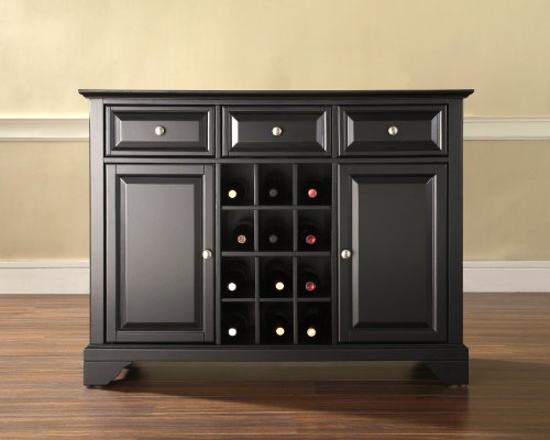 Finish:Black Constructed of solid hardwood and wood veneers, this buffet server/sideboard cabinet is designed for longevity. The beautiful raised panel doors & drawers, provide the ultimate in style to dress up your home. Style, function and quality make this buffet server a wise addition to your home. The three deep drawers provide an abundance of storage space Behind the two doors, you will findthree adjustableshelves and storage space for things that you prefer to be out of sight The center storage area is great for up to 12 bottles of wine, or if you prefer, remove the wine storage cubes to reveal an adjustable shelf Hand rubbed; Multi-Step finish Read more...